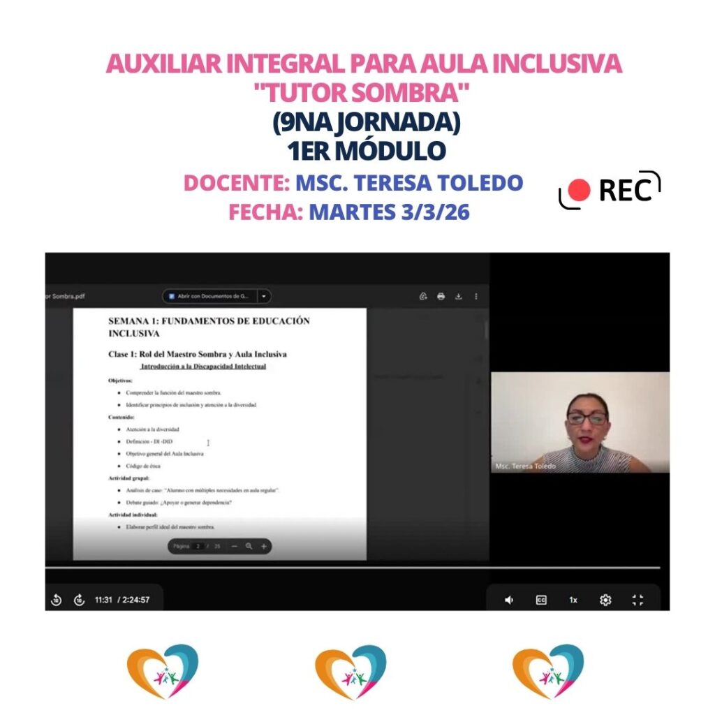 Semana #2 en la Jornada de Auxiliar Integral para Aula Inclusiva o Tutor Sombra / Noticias / Por Editor Semana #2 de la Jornada de la Capacitación de Auxiliar Integral para Aula Inclusiva del primer módulo a cargo de la Msc. Teresa Toledo